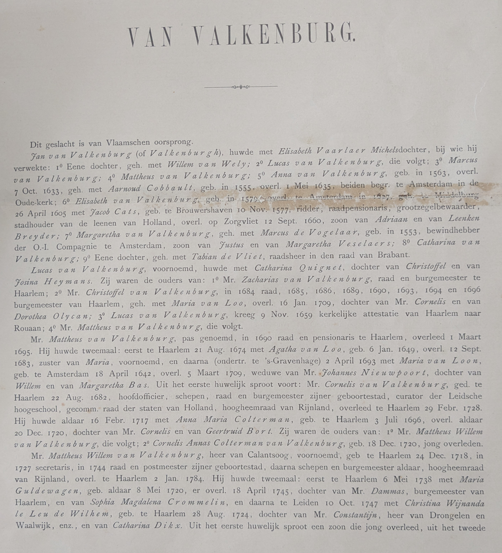 This generation marks the establishment of the Haarlem branch of the family. Lucas van Valkenburg married Catharina Quinget, daughter of Christoffel and Josina Heymans. Through this marriage, the Valkenburg line became aligned with the Quinget and Heymans families, strengthening its position within Haarlem society.
