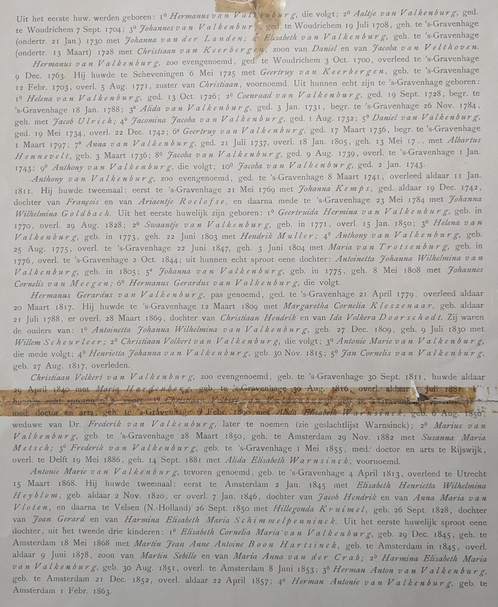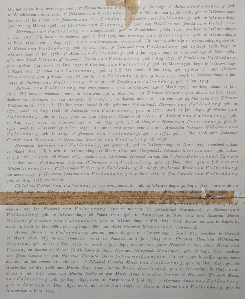 Antonie Marie van Valkenburg (b. 1813 – d. 1868) was the son of Christiaan Volkert van Valkenburg. His life and records mark the Hague / Woudrichem branch’s movement into the mid-19th century. His position represents the last fully verified generation of this line in the genealogical document before later corrected inserts appear.