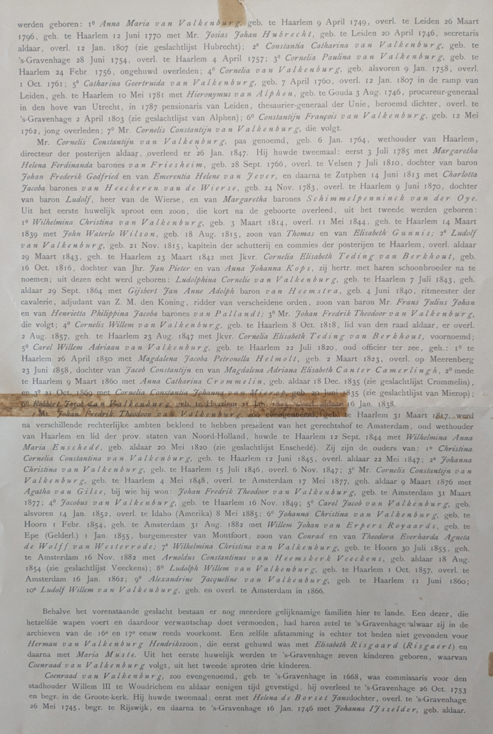 This branch documents the Van Valkenburg family as it settled in The Hague and Woudrichem. While distinct from the Haarlem patrician branch, this line reflects regional civic connections and provides the framework for later nineteenth-century corrected inserts.