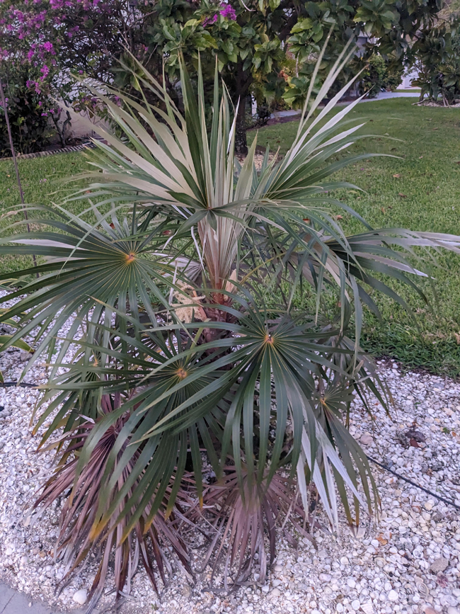 “This slow-growing, small, native Florida palm can reach 20 feet in height but is usually seen at 6 to 10 feet with a spread of 6 feet. The slender silverpalm has distinctive dark blue-green, drooping, delicate, deeply divided palmate leaves which have a beautiful silver color beneath, providing a bright glint in the landscape when the leaves sway in the wind. The 6-inch-wide trunk is either smooth and grey or is sometimes covered with woven, burlap-like fiber. The small, white flowers are borne in profusion on 2-foot-long stalks, hidden among the leaves during the summer. The small, round, purple fruits ripen in late summer and fall.” – IFAS